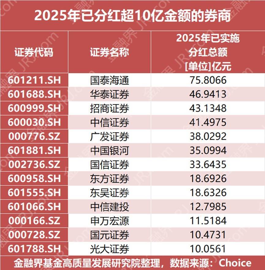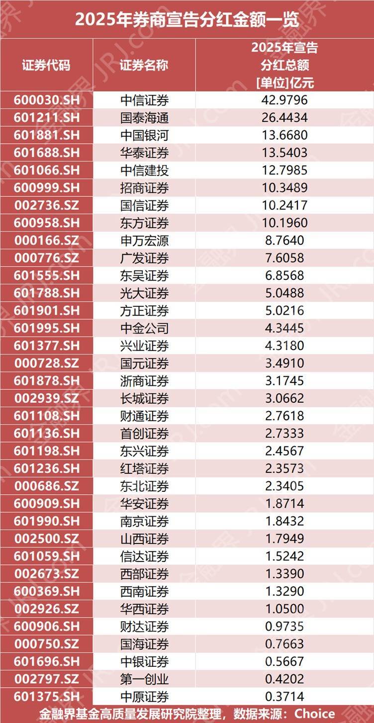 仅从2025年度已宣告的分红方案来看,据Choice数据,截至12月16日,A股已有35家上市券商宣布了2025年的分红计划,拟分红总额合计超过218亿元。其中,中信证券以宣布分红近43亿元,暂居2025年度“分红王”。